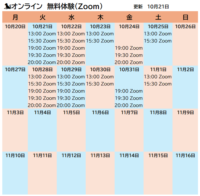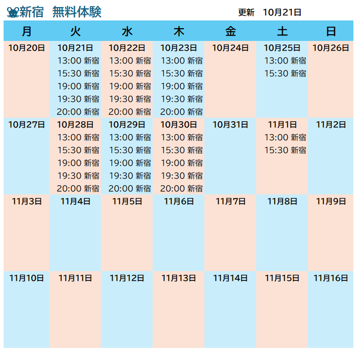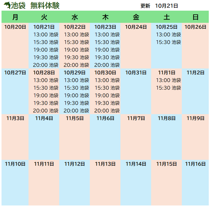 ※ 池袋、新宿、オンラインのカレンダーが並んでいます。どこで無料体験を受けてもお好きな場所に通えます。