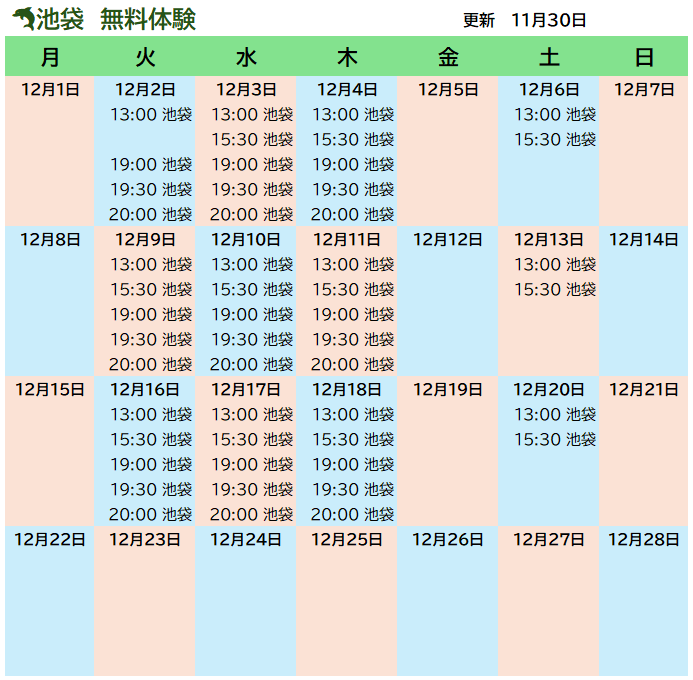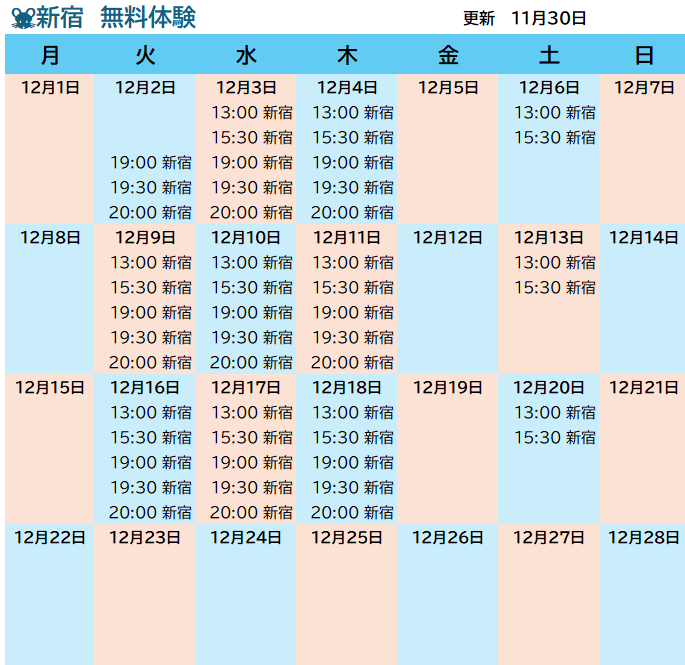 ※ 池袋、新宿、オンラインのカレンダーが並んでいます。どこで無料体験を受けてもお好きな場所に通えます。